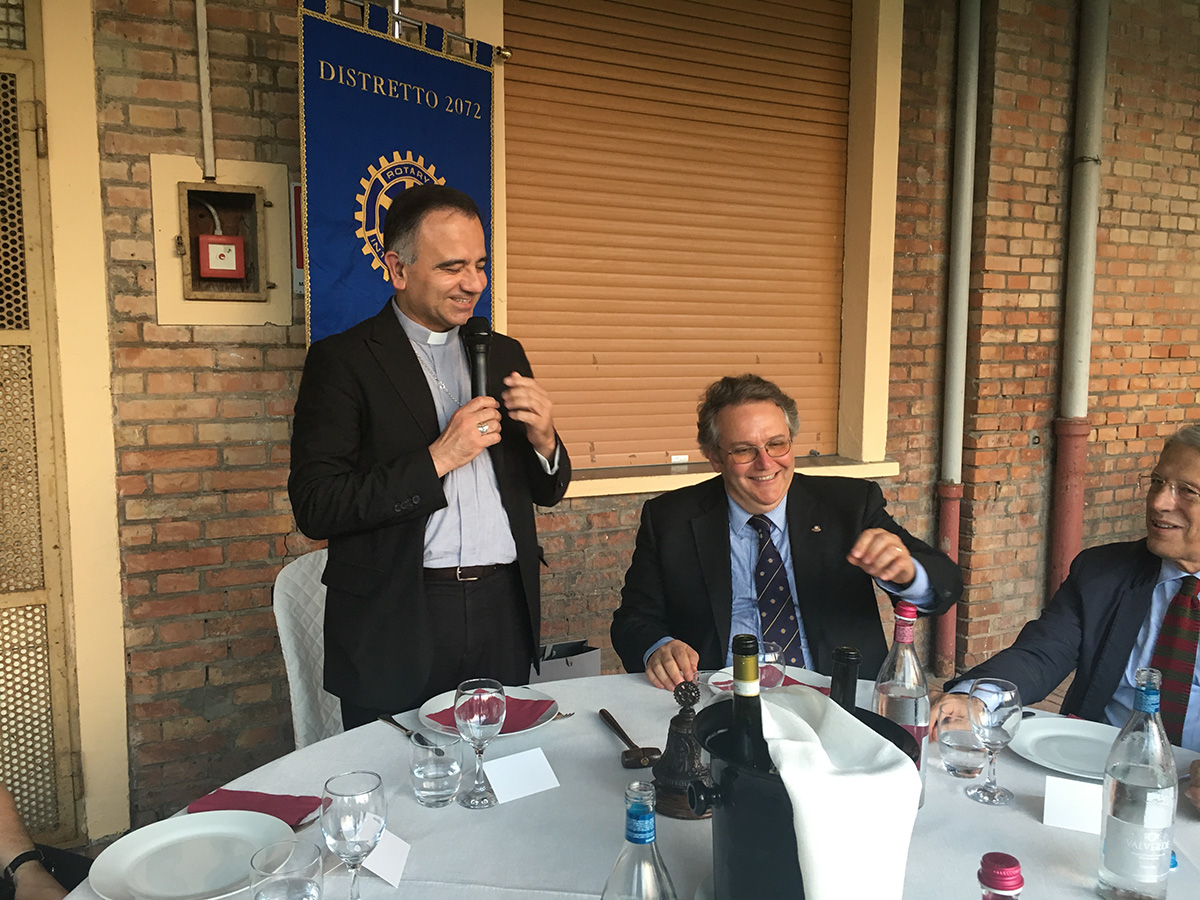 L’Arcivescovo di Modena e Nonantola, monsignor Erio Castellucci, è stato ospite del club nella serata del 13 giugno, che si è svolta alla Città dei Ragazzi di Modena (Cdr) di via Tamburini. Monsignor Castellucci ha parlato del suo progetto di rinnovamento della Diocesi di Modena che prevede alcuni accorpamenti tra le parrocchie, in particolare nel Vicariato centro storico. Qui saranno costituite tre unità pastorali: Sant’Agostino-San Barnaba, San Francesco-San Pietro e San Biagio-Tempio. Verrà chiusa la parrocchia del Duomo e la cattedrale diventerà centro propulsore non solo delle celebrazioni ma anche dell’evangelizzazione. L’Arcivescovo ha poi ringraziato il Presidente del Rotary Club di Modena, Mario Gambigliani Zoccoli, per avere donato le risorse necessarie a installare un nuovo impianto di illuminazione nel porticato della Cdr e per la tinteggiatura dei soffitti dello stesso. L’Arcivescovo ha quindi ricambiato regalando insieme a Don Stefano Violi, responsabile della Città dei Ragazzi, ai soci presenti una copia del volume “La Citta’ dei Ragazzi di Modena, Don Mario Rocchi e un sogno lungo 70 anni” edito da Artestampa, che racconta la storia della struttura modenese divenuta nel tempo uno dei piu’ vivaci centri italiani dedicati alla cura e alla formazione dei giovani.