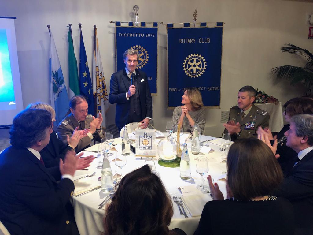 La Sanità Militare e l’Esercito protagonisti della serata svolta presso il ristorante La Secchia Rapita in interclub con il RTY Club di Vignola-Castelfranco-Bazzano. Il Magg.Gen.Medico Antonio Battistini, Comandante della Sanità e Veterinaria dell’Esercito Italiano, ha documentato alla numerosissima e attenta platea di soci e ospiti il ruolo che oggi svolge la compagine sanitaria “da campo” nelle aree mondiali dei conflitti, ma soprattutto ha delineato quello che potrebbe essere il ruolo dei militari al servizio dei cittadini integrandosi con la sanità pubblica laica.